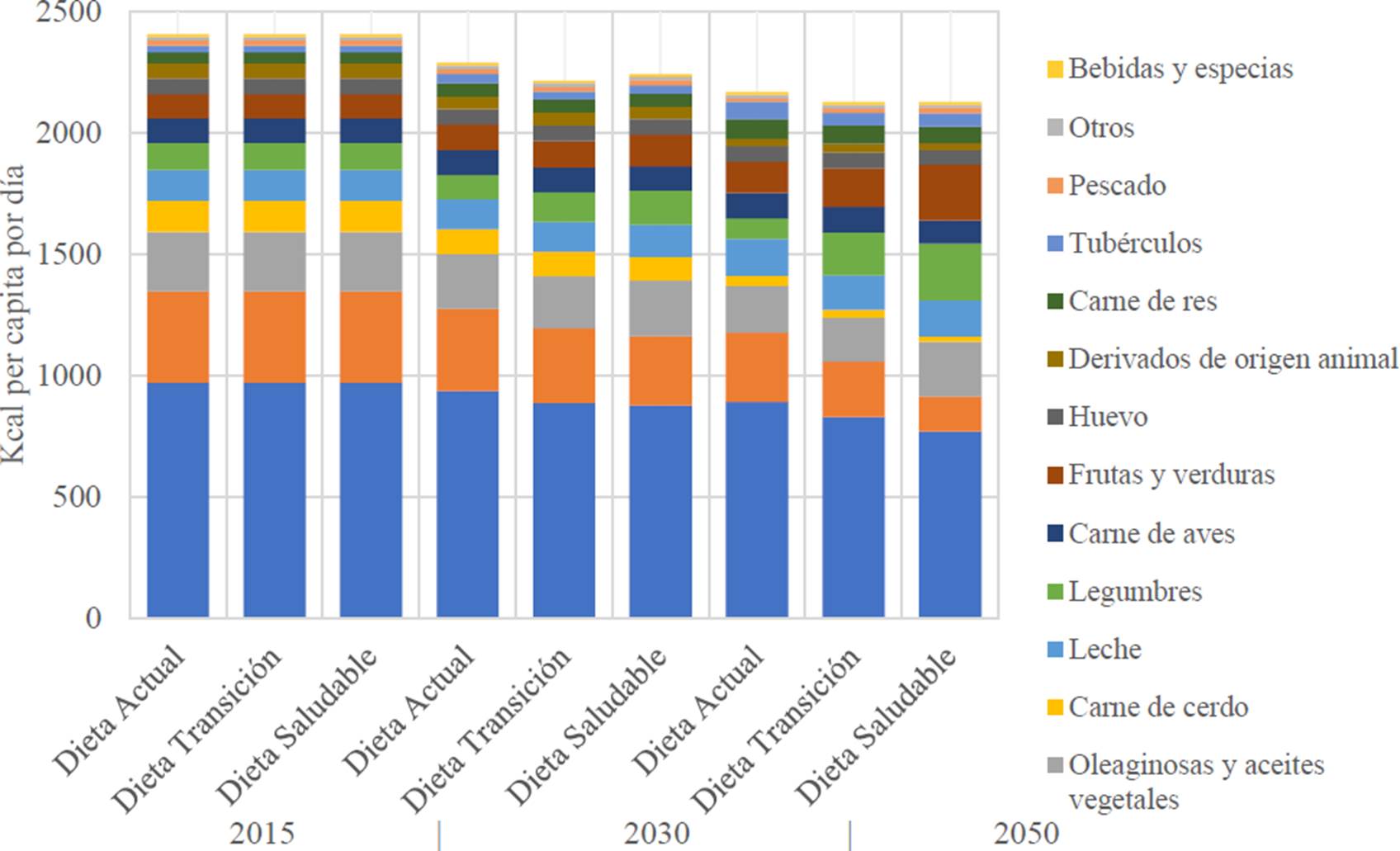 En la dieta actual hay un aporte de 2,168 kcal per cápita por día compuesta principalmente por cereales, azúcar, oleaginosas y aceites vegetales, leche, carne de aves y frutas y verduras equivalente a un 80% de las calorías disponibles y se espera que tanto como la dieta de transición como la dieta saludable tengan un menor consumo total de calorías para el 2050; y en total hay una disminución de 240 kcal per cápita por día lo que es igual a 9.97%. Se presenta una reducción en el consumo de alimentos de varios grupos de alimentos incluyendo cereales, azúcar, carne de cerdo, carne de aves, huevo, derivados de origen animal, carne de res, tubérculos y pescado, en los escenarios de dieta de transición y dieta saludable en comparación con la dieta actual para el 2050. En este escenario hay un mayor consumo de alimentos saludables, el grupo de productos frutas y verduras experimenta un aumento significativo, pasó de aportar 100 kcal a 230 per cápita kcal por día (un aumento del 6.7%) en el consumo en los escenarios de dieta de transición y dieta saludable para el 2050. Esto sugiere un cambio hacia una dieta más rica en alimentos saludables y frescos. El grupo de producto legumbres también experimenta un aumento notable en el consumo, en los escenarios de dieta de transición y dieta saludable (aumentó en 6.4%), lo que indica una mayor inclusión de alimentos ricos en proteínas vegetales en la dieta.
