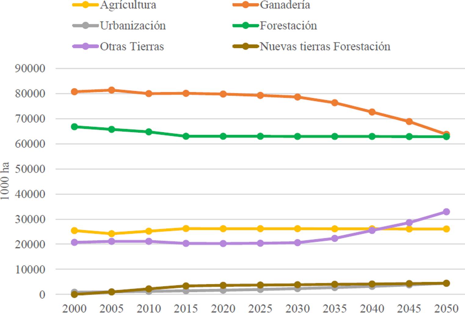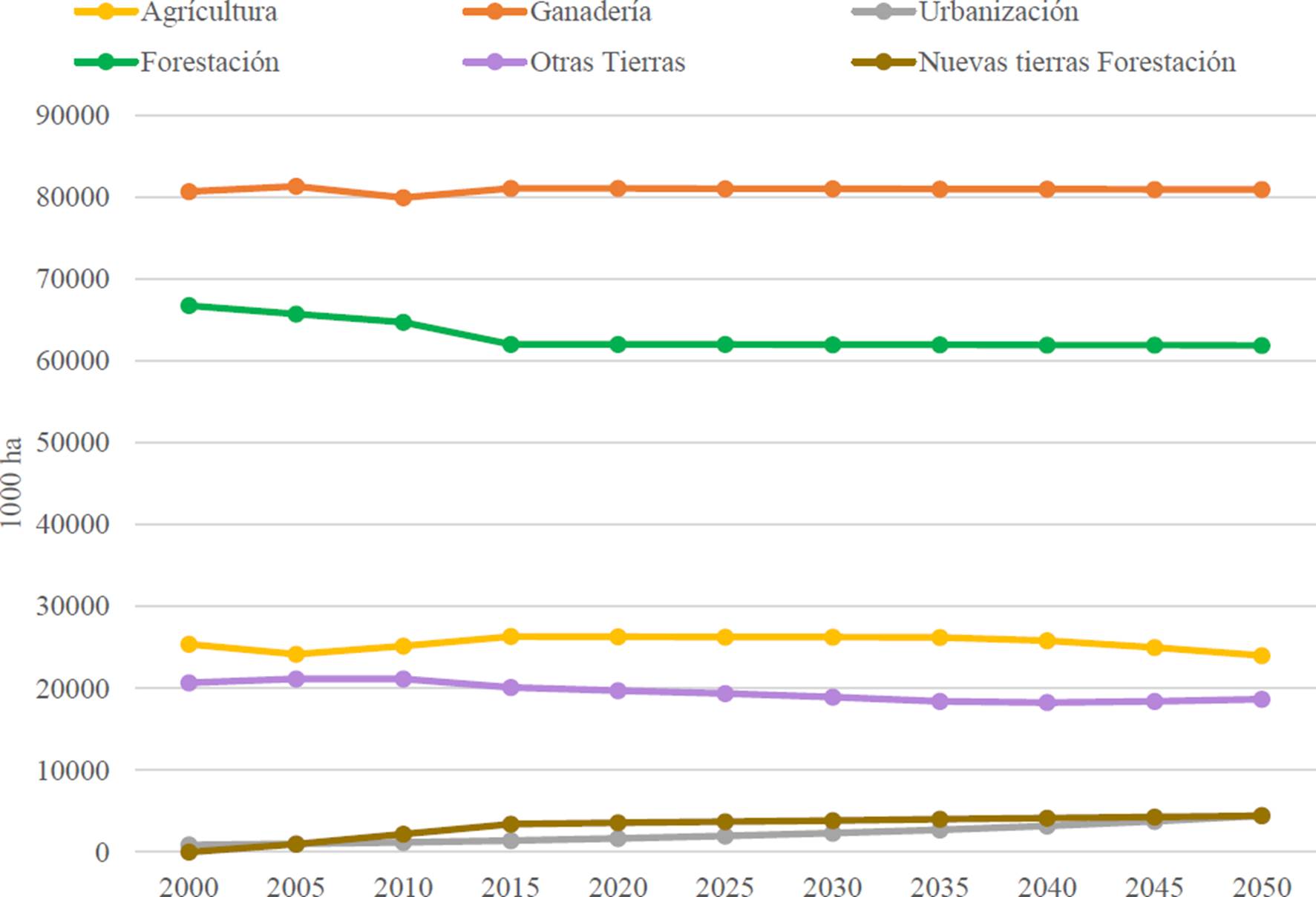 En la Gráfica 3 se muestra la interacción de una dieta saludable y una PDA reducido y el cambio en el uso de suelo, dando como resultado que las áreas que se dedicaban a la ganadería para el 2050 se reducen en 20,000 ha, mientras que el área para la producción agrícola aumenta en 2,000 ha; debido a que a una mayor eficiencia en la producción de alimentos, ya que se reduce la pérdida y el desperdicio y la deforestación es baja y estable en comparación con el escenario anterior, lo que sugiere un enfoque hacia la conservación.