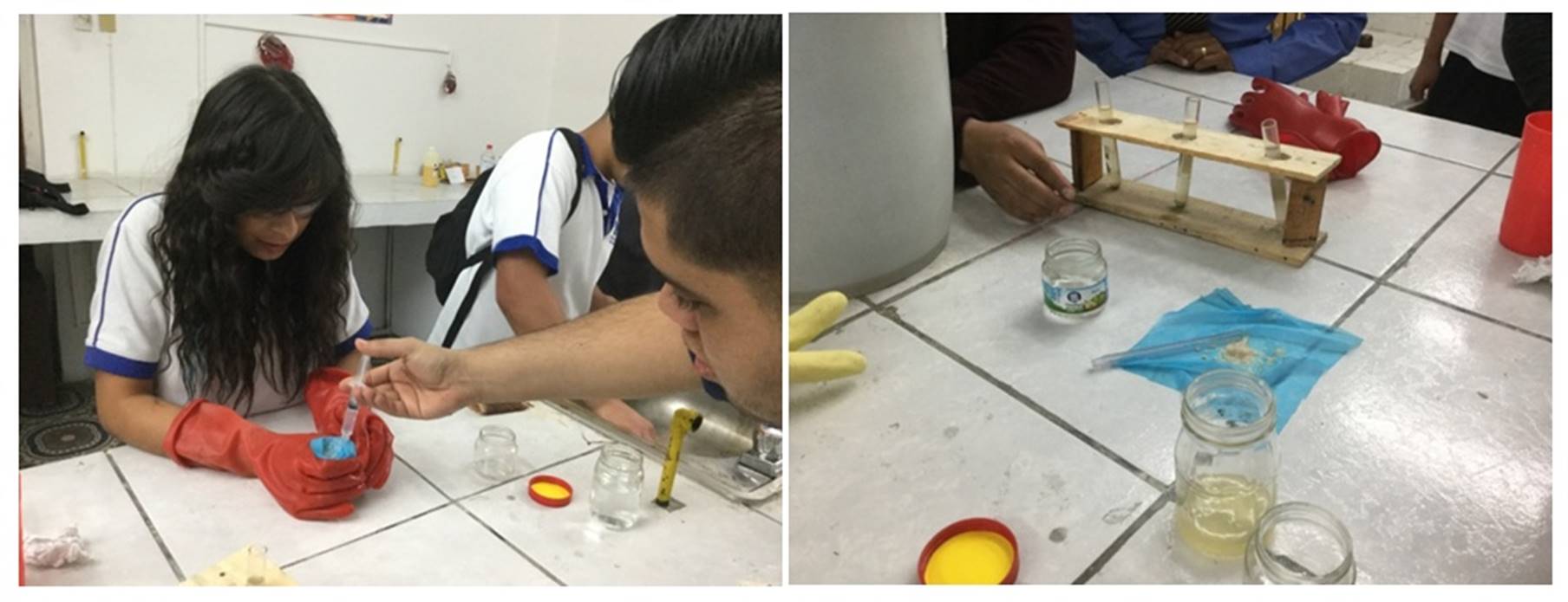 En la Foto 2 los alumnos están llevando a cabo la filtración de los residuos de exoesqueletos de camarón usando utensilios caseros como frascos, jeringas y tela. Se aprecia además en el lado derecho de la imagen una gradilla de madera que fue construida por los propios alumnos.