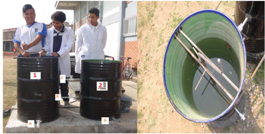 Los elementos imprescindibles en el diseño de la planta de tratamiento fueron el tamaño y el funcionamiento (ver Foto 4). El tamaño porque podría ser móvil, es decir, llevarla de un lugar a otro. En segundo lugar, que para el funcionamiento no utilizara energía eléctrica, es decir, que fuera manual. Los materiales que se usaron fueron dos tambos de 200 litros, cuatro llaves de paso, dos metros de tubería, dos metros de varilla, un balero y pintura. Debido a las políticas de seguridad del plantel educativo, los alumnos tienen prohibido manejar herramientas industriales, por lo que la planta fue ensamblada por el técnico de mantenimiento. El funcionamiento propuesto se describe a continuación. Ver Foto 5.