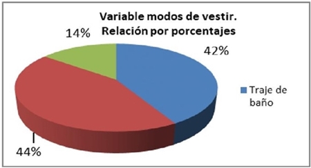 Puede verse que la proporción del uso del traje de baño y traje de playa es similar. Dado que el relevamiento de la variable anterior -variable situación cuerpo-espacio- reflejó un alto porcentaje de mujeres sobre la arena -en comparación con el mar-, la semejanza de porcentajes no deja de ser alentadora.