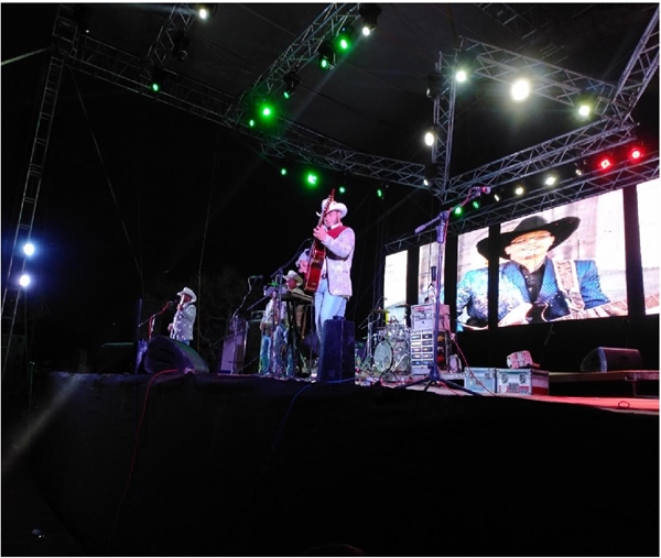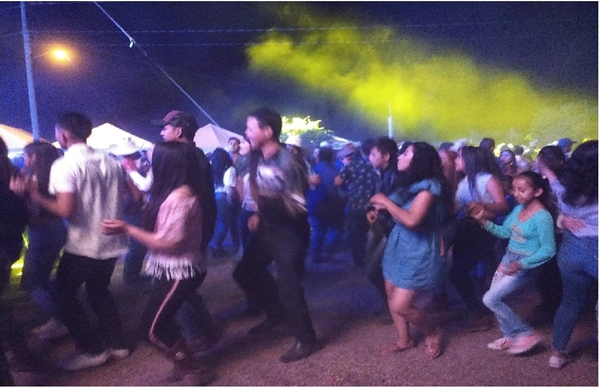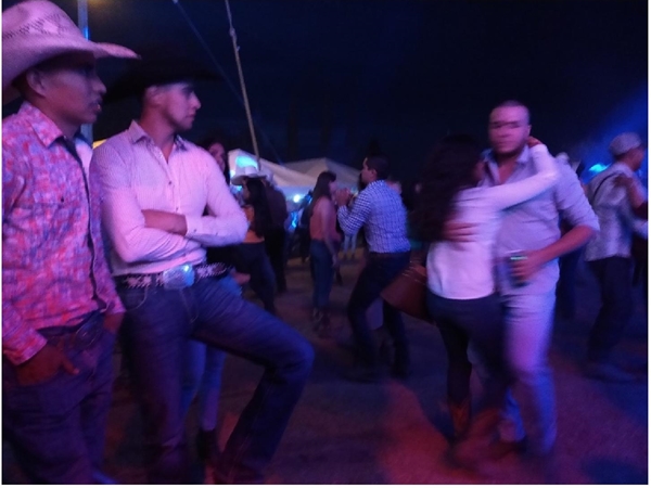 Durante el evento musical, una serie de intercambios entre los músicos y el público establece los campos de interacción entre los diferentes grupos sociales que acuden al evento. El concierto inicia con una introducción instrumental en donde los músicos defienden a su banda como “la diferencia de la música norteña”. Unos instantes más tarde el vocalista solicita escuchar el grito de las mujeres a lo que gran parte del público femenino responde fervientemente. Mientras el vocalista agradece la invitación y la asistencia del público, se escuchan de fondo algunas percusiones y el bajo sexto. El vocalista arenga a que todos se levanten a bailar “en filita”, es decir, a formar una larga fila de personas que avanzará de forma circular (Imagen 2), el público responde a la solicitud y se va incluyendo dentro de ésta. En el espacio designado para el baile se encuentran grupos de personas compuestos solamente por hombres, mujeres o mixtos. Algunos se sitúan muy cerca del escenario, otros están esparcidos por el terreno. La mayoría de estos grupos (indistintamente del género) tienen reservas de bebidas alcohólicas, generalmente cerveza, tequila o whisky. La fila principal del baile se abre por entre estos grupos de personas.
