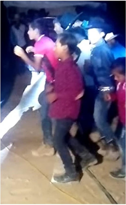 La Imagen 8 muestra un grupo de niños practicando el baile comunitario del huapanguero merequetengue. Su performance ilustra algunas formas en que los patrones de comportamiento que contribuyen al desarrollo de la expresión de género son enseñados-aprendidos a través del baile, que funge como un momento de experimentación para performar la masculinidad en la raza huapanguera. No obstante, las normativas sociales con respecto a la identidad de género que los individuos exhiben a esta edad suelen ser más laxas, así como lo son las categorías usadas para referirlos. La pregunta que sigue es: ¿en qué momento de su vida se les comienza a decir “putivaqueros”? En las rancherías donde se realizan los bailes, la vida de adultos comienza aproximadamente a los quince años cuando tienen que cumplir con las tradiciones asignadas por su rol de género: trabajar y llevar dinero a sus casas. Es en ese momento cuando socialmente se espera que tanto su expresión de género, como su identidad sexual estén definidas en apego al binario heterosexual y que como tal lo expresen en el baile.