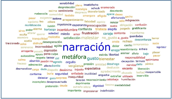 Llama la atención que la “emoción” más frecuente es la “narración” seguida de la “metáfora”. Ninguna de las dos en sí misma es una emoción. ¿Por qué, entonces, se incluyen aquí? Porque, como veremos más adelante, su contenido se refiere a emociones sin llegar a definirse con una etiqueta.