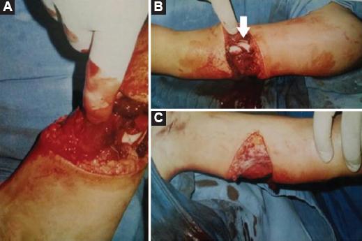 Figure 1 A: Surgical exploration with a loss of more than 75% in the soft tissue as well as avulsion of the biceps and triceps muscles. B: Oblique fracture of humeral bone and the entire brachial neurovascular bundle (arrow). C: The continuity in the brachial muscle is observed.