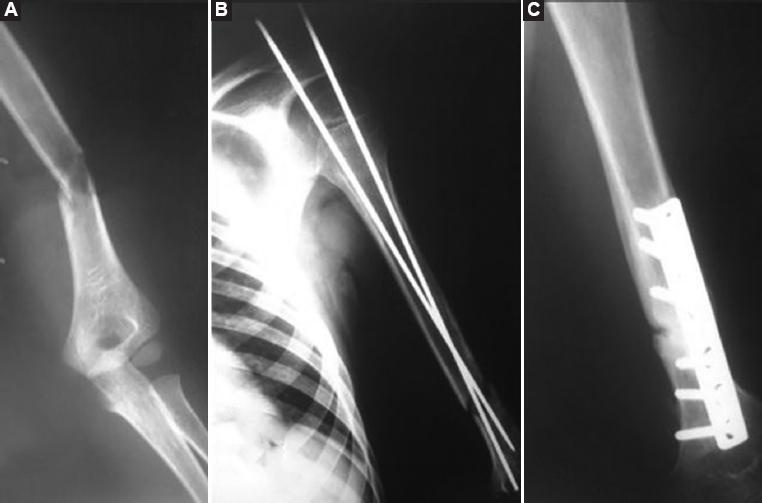 Figure 2 A: Pre-surgical X-ray showing a humerus oblique fracture of the patient. B: Smooth Kirschner wires were used to stabilize the fracture and make soft tissue reparation. C: Control X-ray after nerve and soft tissue repair.