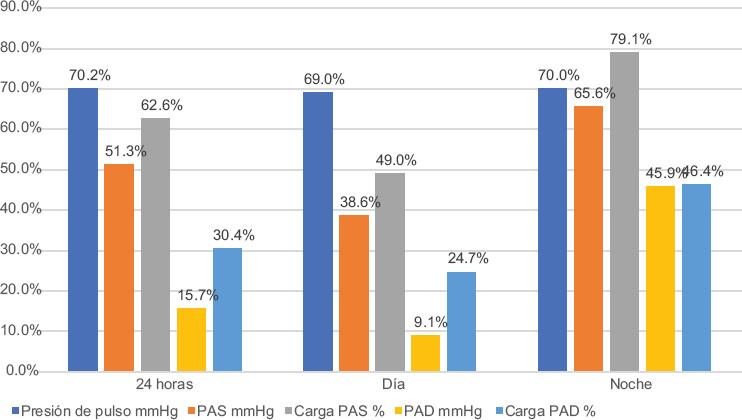 El análisis de los resultados evidenció una mediana de frecuencia cardiaca de 72 latidos por minuto, presión de pulso de 56 mmHg, presión arterial sistólica de 130 mmHg con carga del 38% y promedio de presión diastólica de 71 mmHg con carga del 11%. En cuanto a los periodos del día y la noche, se encontraron respectivamente unas medianas para la presión de pulso de 56 y 57 mmHg, para la presión sistólica de 130 y 128 mmHg con cargas del 24% y el 75%, y para la presión diastólica de 72 y 69 mmHg con cargas del 5% y el 20%. Durante el periodo de 24 horas se registró elevación de la presión de pulso en el 70.2% de los pacientes, hipertensión sistólica en el 51.3% e hipertensión diastólica en el 15.7%. La discriminación detallada de los hallazgos en los monitoreos de presión de 24 horas se muestra en la tabla 1.