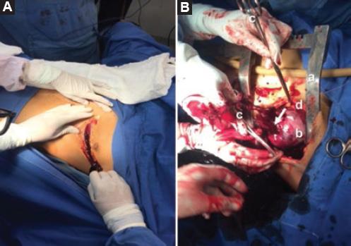 Figura 1 A: abordaje quirúrgico mediante toracotomía anterolateral izquierda (Spangaro). Entre sus principales ventajas está la velocidad con la que puede realizarse para tener rápido acceso a los órganos torácicos. B: tras la apertura del pericardio (tomado entre dos pinzas Allis) puede observarse una lesión en el ventrículo izquierdo. Nótese la abundante salida de sangre (flecha) secundaria a la lesión. a: separador de Finochietto; b: ventrículo izquierdo; c: pinzas Allis; d: pericardio.