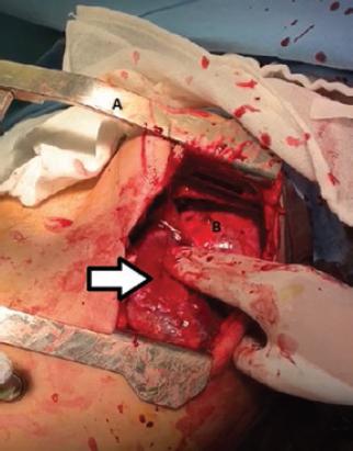 Figura 4 Toracotomía anterolateral izquierda. Obsérvese la cantidad de espacio que se obtiene al abordar lesiones cardiacas. A: separador de Finochietto. B: pulmón izquierdo; flecha: lesión en la pared libre del ventrículo derecho.