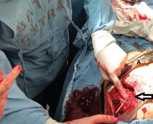 Figura 5 Reparación del ventrículo derecho mediante punto en U con poliglactina 910. A: separador de Finochietto. B: portaagujas Mayo-Hegar. VD: ventrículo derecho; flecha: control digital de la lesión previo a la aplicación de la sutura.