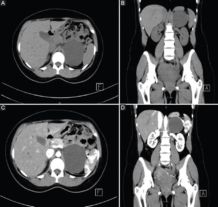 Mujer de 22 años con antecedente de cesárea. Refiere cuadro de 5 años de evolución con dolor tipo cólico de intensidad 8 en la escala visual analógica del dolor, localizado en la región dorsal lumbar izquierda con irradiación al flanco homolateral, el cual aumenta con la actividad física y mejora con el reposo. Niega sintomatología urinaria. A la exploración física no se observa ninguna alteración. Se solicitó una TC sin y con contraste yodado intravenoso (Fig. 1), la cual reportó un tumor quístico suprarrenal izquierdo de bordes delgados, bien definidos, y con interior homogéneo en rango líquido (18 UH), que no presentaba realce al medio de contraste, con un tamaño aproximado de 7.7 × 6.7 × 6.1 cm, para un volumen de 164.5 cm3. Ya que las imágenes eran características de un quiste simple y la paciente no presentaba datos de un quiste metabólicamente activo, no se realizaron pruebas de funcionalidad. Debido a la sintomatología y las dimensiones del quiste, se decidió realizar un destechamiento de quiste suprarrenal izquierdo laparoscópico (Fig. 2). El tiempo quirúrgico fue de 2 horas y 45 minutos, con un sangrado de 100 ml. No se presentaron complicaciones durante la cirugía. La evolución posquirúrgica fue favorable y se dio el alta hospitalaria a las 48 horas. El reporte histopatológico indicó que se trataba de un quiste simple suprarrenal; la citología indicó muestra con fondo limpio y escasos fragmentos fibrilares, donde no se observan células inflamatorias ni células atípicas. En su primera cita de seguimiento, la paciente refería dolor únicamente en las heridas quirúrgicas, de intensidad leve. A 5 meses de seguimiento, la paciente permanece asintomática.