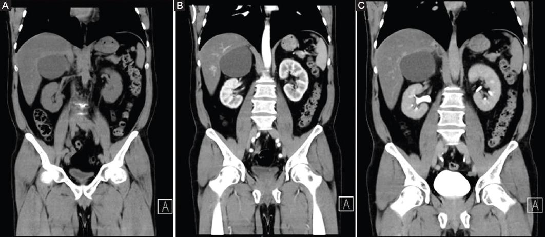 Varón de 42 años con antecedentes de hipertensión arterial sistémica de 1 año de diagnóstico. Refiere que hace 1 año, durante el manejo de la hipertensión arterial, se le realizó un ultrasonido renal, con hallazgo de una lesión probablemente dependiente de la glándula adrenal derecha. A la exploración física no muestra alteraciones. Se solicita una TC sin y con contraste yodado intravenoso (Fig. 3), en la cual se observa un quiste adrenal derecho con bordes regulares, de 8.6 × 7.6 × 6.9 cm, con interior hipodenso en rango líquido (14 UH), que no cambia con la administración del medio de contaste. Se decide realizar destechamiento de quiste adrenal derecho laparoscópico debido al tamaño del quiste. El tiempo quirúrgico fue de 62 minutos y el tiempo anestésico fue de 75 minutos, con un sangrado de 20 ml. No se presentaron complicaciones durante la cirugía. La evolución posquirúrgica fue favorable y se dio el alta hospitalaria a las 24 horas. El reporte histopatológico indicó un quiste simple de glándula suprarrenal. Se realiza seguimiento del paciente en la consulta externa y a los 20 días de la cirugía permanece asintomático.