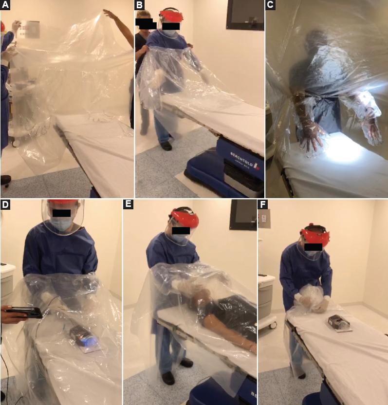 Figure 1 A: placing the device on the OR Table. B: dressing the physician with the device. C: full hand access through the device and within the integrated gloves. D: intubating with an electronic fiberscope. E: easy access to the airway. F: easily foldable, and completely disposable device.