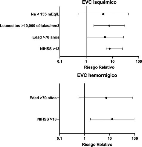 El análisis de regresión logística binaria (Tabla 3 y Fig. 1) mostró que, en ambos grupos, la presencia de una puntuación NIHSS grave (> 13) presentó una asociación estadísticamente significativa con la mortalidad hospitalaria (para EVCi, RR: 24.36, IC95%: 5.8-102.26, p < 0.0001; para EVCh, RR: 9.16, IC95%: 1.14-73.23, p = 0.037). Adicionalmente, en los pacientes con EVCi la cifra de leucocitos > 10,000 células/mm3 (RR: 7.56, IC95%: 1.94-30.3, p = 0.004) y la edad > 70 años (RR: 5.17, IC95%: 1.07-26.64, p = 0.049) presentaron asociación estadísticamente significativa con la mortalidad hospitalaria.