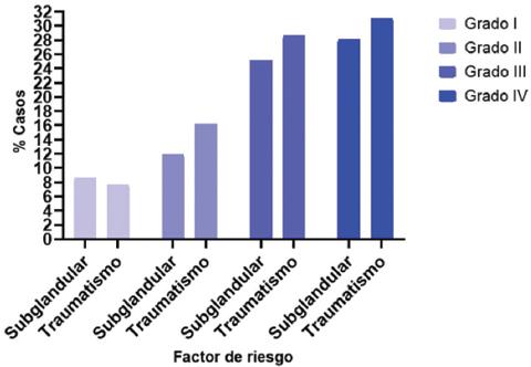 No se encontraron diferencias estadísticamente significativas entre los distintos niveles de la clasificación de Baker en relación con la edad, la ocupación, la diabetes mellitus, la hipertensión arterial, el IMC y el tiempo de presentación clínica. Los únicos datos estadísticamente significativos fueron el antecedente de traumatismo (p = 0.004) y el plano subglandular (p = 0.0115) (Tabla 3).