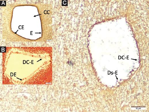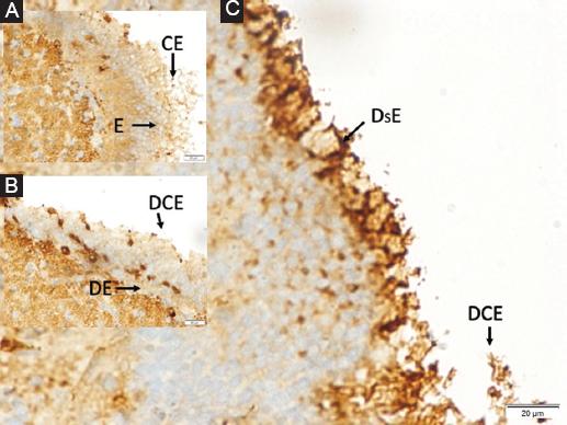 Figure 4 A: normal ependymal cells (E) and ciliary extensions (CE) in a rabbit belong to the control anima, B: moderately deformed ependymal cells (DE) and desquamated ciliary extensions (DCE) in a SHAM animal, and separated basal membrane, C: highly edematous-deformed and desquamated ependymal cells (Ds-E) whose cytoplasm is darkened and condensed and lost their ciliary extensions significantly (DC-E) in a study animal (LM, GFAP, × 50/A, B, C).