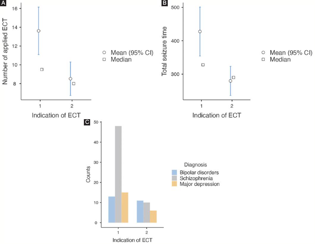 ECT maintains its essential place in the treatment of psychiatric patients, although stigmatization problems persist. Many large-scale studies reveal the characteristics of patients receiving ECT and the effectiveness of the treatment7,8,10. There are also studies comparing the effectiveness of ECT on a diagnostic basis and the prominent features in different groups7,8,12. However, there are a limited number of studies comparing ECT according to indications. In this respect, our study is one of the first steps in filling a significant gap.
