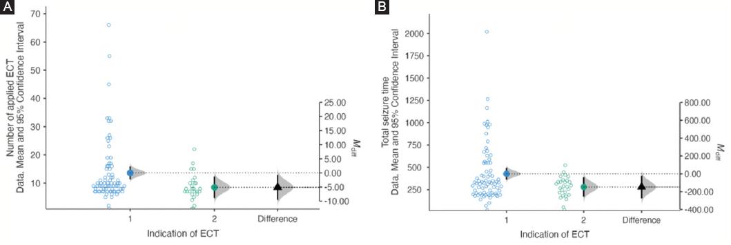 In a retrospective cohort study at the inpatient psychiatry clinic of Çam and Sakura City Hospital between January, 2021, and February, 2023, 103 patients receiving ECT were analyzed. They were categorized into two groups according to indications that suicide risk (n = 76) and resistance to pharmacotherapy (n = 27).