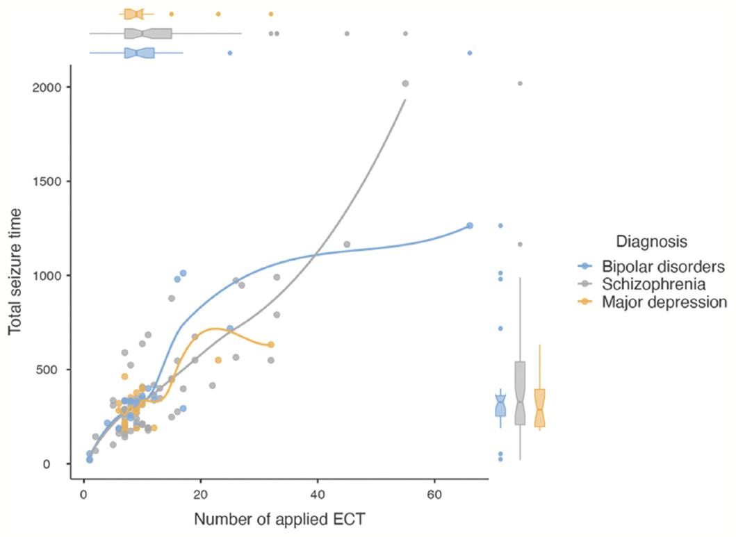 Figure 3 A scatter plot of diagnosis, number of applied electroconvulsive therapy, and total seizure time.