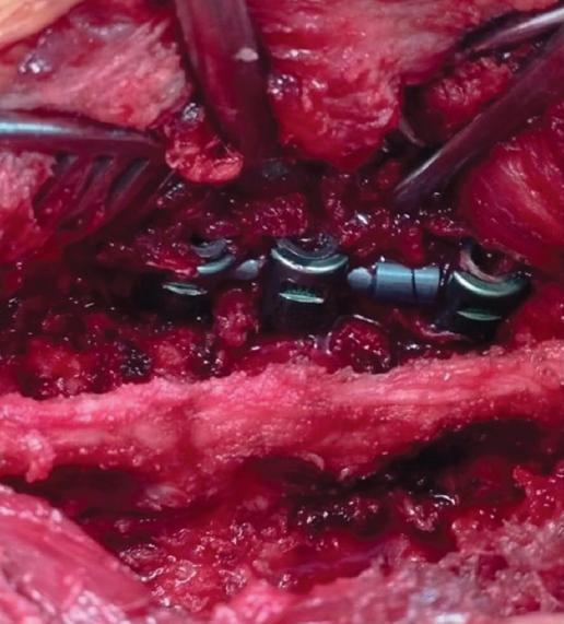 For Group 1, patients were first positioned in the prone position and a midline incision was made, passing through the skin and subcutaneous layers. Bone structures were exposed through blunt muscle dissection. Under fluoroscopy guidance, pedicle screws were appropriately placed. The rigid rod system was locked to the pedicle screws. Procedures such as laminectomy, hemilaminectomy, or facetectomy were performed for decompression. Discectomy was applied to some patients. Fusion was performed for patients using allogeneic and autologous bone grafts, 5 cc for each level. Decortication was applied to the bones to expand the fusion area (Fig. 4)10,11.