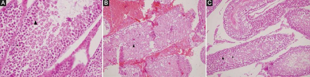 Figure 2 A: sertoli cell, spermatogonia (↑), and Spermatocyte (▲) in testicle of group 1. B: diffuse fresh bleeding in the interstitial area and exfoliated necrotic cells in seminiferous tubule lumen, few ghost germinal epithelial cells in the left testicular tubule lumen belonging to group 2 (▲) (H&E ×100). C: Spermatids (↑) and spermatozoons (▲) in the testis belonging to group 3.