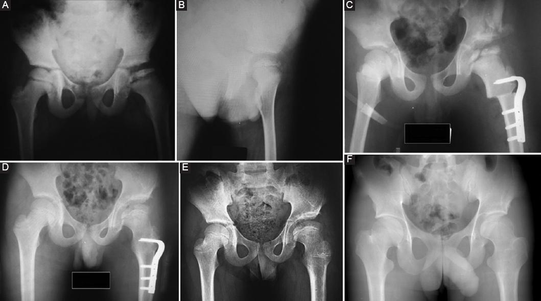 Figure 1 Plain radiographs of an 11-year-old boy following femoral valgus extension osteotomy combined tectoplasty. A: pre-operative anteroposterior radiograph. Herring group C Perthes. Femoral head subluxation and flattening B: pre-operative lateral radiograph C: early post-operative anterior-posterior radiograph D: post-operative 1-year anterior-posterior radiograph E: post-operative 4-years anterior-posterior radiograph F: last follow-up post-operative anterior-posterior radiograph. There is good and lasting coverage with satisfaction of the femoral head.