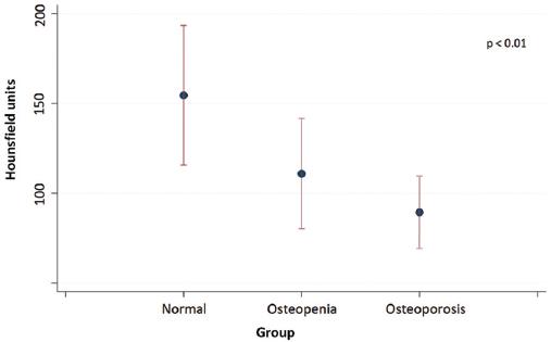 Figure 2 Mean Hounsfield Units (HU) values (± standard deviation), stratified by normal bone mineral density, osteopenia, and osteoporosis. (According to DXA reference standard). The differences in HU among the three sub-groups are statistically significant (p < 0.01).