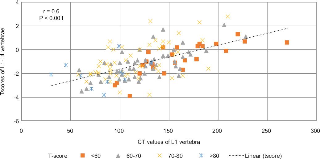 For all patients, a moderate correlation of 0.6 was found between T-score and HU. This correlation was statistically significant (p < 0.001) (Fig. 3).