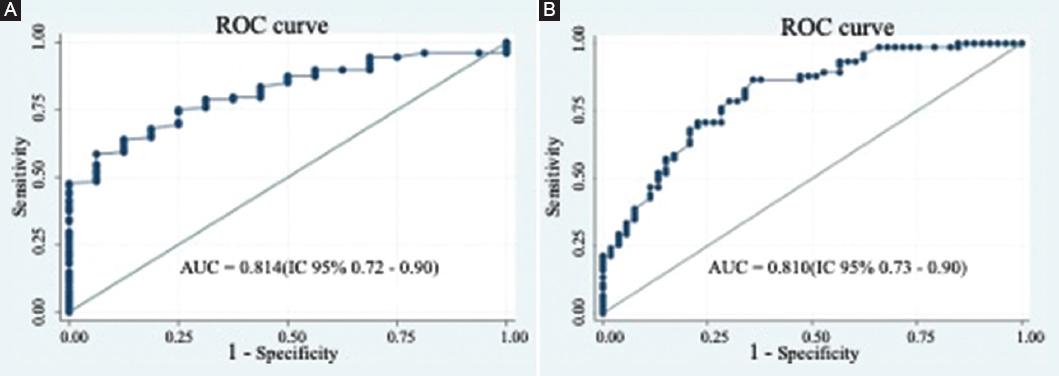 The diagnostic capacity of HU through CT to differentiate OP from no OP (osteopenia, normal BMD) with an equilibrated cut-off point was 101 HU (75% sensibility, 75% specificity), (AUC 0.81 [IC 95% 0.72-0.9]). (Fig. 4A) 118 HU was determined as the cut-off value for high-sensitivity results (89% sensibility, 59% specificity). While 80 HU was determined as the cut-off value for high-specificity results (40% sensibility, 90% specificity). 126 HU was found to be the equilibrated cut-off point to discriminate normal BMD patients from osteopenia patients (79% sensitivity, 73% specificity), (AUC 0.8102 [IC 95% 0.766-0.9001]) (Fig. 4B). 155 HU was determined as a high sensibility value (89.3% sensitivity, 48% specificity) while 102 was determined as a high specificity value (52% sensitivity, 88.7% specificity).
