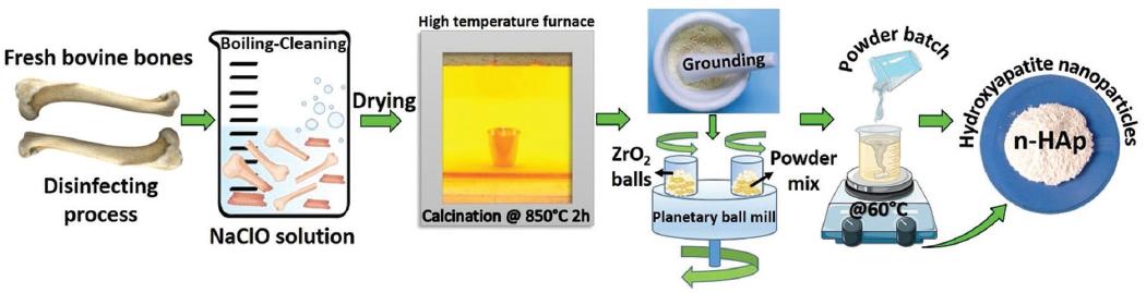 As per our previous research8,9. n-HAp was synthesized from natural bovine bones (femur) through a detailed method outlined below. Initially, freshly collected bone segments were thoroughly cleansed and subjected to six cycles of boiling in dH2O. To remove any residual fats, they were then degreased using 70% ethanol (EtOH). Subsequently, the bone pieces were immersed in a solution of NaClO (30% v/v) and left to dry for a minimum of 48 h before further processing. The dried bone segments underwent a calcination process at a temperature of 850°C, with a gradual heating rate of 5°C/min, and were maintained at this temperature for 4 h in the presence of air to ensure the elimination of any prions, such as Creutzfeldt-Jakob disease or Bovine Spongiform Encephalopathy. Following calcination, the bovine femoral bone parts were finely crushed into small pieces and then subjected to planetary ball milling using the Fritsch Planetary Micro Mill Pulverisette 7 premium line from Germany. This milling process was carried out in isopropyl alcohol using ZrO2 balls at a speed of 300 cycles/min for a duration of 144 h, maintaining a ball-to-powder ratio of 10:1. Subsequently, the milled powder samples were dried in a pyrex pan. Ultimately, the resultant natural hydroxyapatite nanoparticles (n-HAp) were stored at RT in a desiccator for further use10,11. Figure 1 shows the experimental steps followed in obtaining n-HAp. This rigorous method ensures the production of high-quality n-HAp from bovine bones, providing valuable biomaterials for various biomedical applications.