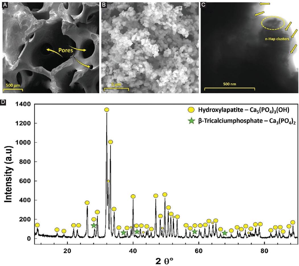 Figure 2D displays the XRD patterns of n-HAp. The dominant crystal phase identified in the XRD patterns is hydroxyapatite (HAp) – [Ca5(PO4)3(OH)] with varying peak intensities. In all analyses, the diffractograms confirm the presence of [Ca5(PO4)3(OH)], which predominantly matches n-HAp (JCPDS card number 84-1998).