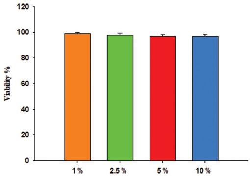We applied VG/nHAp gel to the cells at different concentrations (1%, 2.5%, 5%, and 10%). Cell viability was calculated and plotted in figure 2. VG/nHAp applied on healthy L929 fibroblast cells did not result in significant differences in cell viability at different concentrations. VG/nHAp applied on healthy L929 fibroblast cells did not alter the nuclear morphology of cells at different concentrations (Fig. 3).