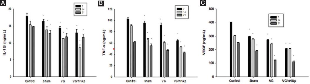 In our experimental study, IL-1β, TNF-α, and VEGF levels in blood samples taken from all groups on days 7, 14, and 21 were analyzed by the ELISA method. IL-1β and TNF-α, which are proinflammatory cytokines, regulate the mechanism by upregulating in the inflammatory phase of the wound healing process. IL-1β, TNF-α, and VEGF levels gradually decreased in Control, Sham, VG, and/nHAp groups on days 7, 14, and 21. However, as seen in Fig. 4A-C, this decrease is especially evident in the VG/nHAp group.