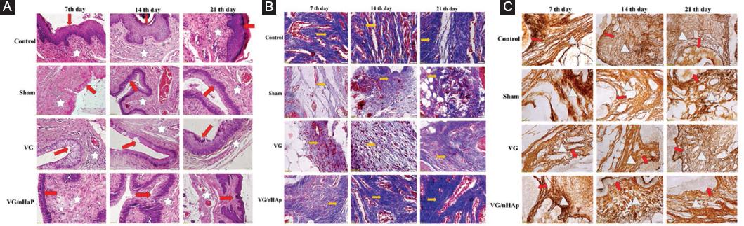 It has been shown that collagen deposition by skin fibroblasts starts within 3-5 days after injury and continues for several weeks, depending on the size of the wound48,49. Type 1 and type 3 forms of collagen, which have various subtypes, are commonly found in skin and mucosa. They strongly bind to cells to support epithelial and lamina propria formation and maintain tissue integrity50. In our study, we wanted to determine the amount of collagen with masson trichrome stain and reticular fiber (type 3) collagen with the silver precipitation technique to understand whether wound healing occurs properly with the proposed biomaterials. In the sham group, the amount of collagen fiber increased from the 7th to the 21st day after injury. However, the amount of collagen and reticular fiber in the VG and VG/nHAp groups was higher than in the Sham group. Especially in the VG/nHAP group, there was a significant increase in collagen and reticular fibers compared to the other groups.