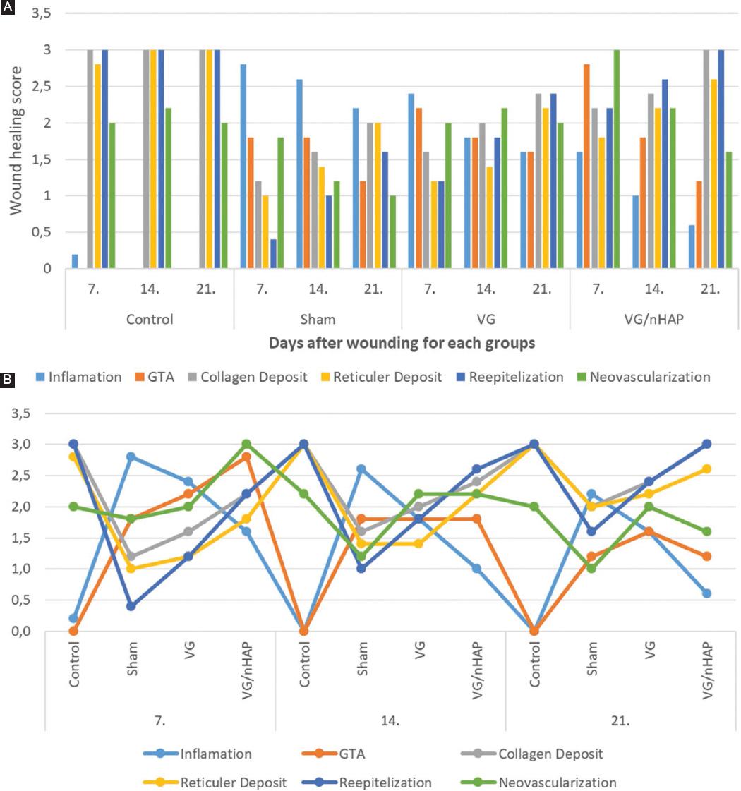 According to Table 2, for the score values obtained from the subjects in the control group, no significant difference was found between the 7th, 14th, and 21st day scores in any parameter (p > 0.05). For the score values obtained from the subjects in the sham group, no significant difference was found between the 7th, 14th, and 21st day scores of the other parameters, except for the reepithelialisation parameter (p > 0.05). There was a significant difference for the re-epithelialization parameter (p < 0.05), and significant increases were observed at each follow-up time. Re-epithelialization value reached its highest value on the 21st day. For the score values obtained from the subjects in the VG group, no significant difference was found between the 7th, 14th, and 21st day scores of the other parameters, except for the inflammation parameter (p > 0.05). There was a significant difference for the inflammation parameter (p < 0.05), and significant decreases were observed at each follow-up time. Re-epithelialization value reached its lowest value at day 21. For the score values obtained from the subjects in the VG/nHAp group, a significant difference was found between the 7th, 14th, and 21st day scores of the other parameters, except for collagen deposit and re-epithelialization parameters (p < 0.05). Although there were not enough changes to find a significant difference for re-epithelialization and collagen deposit parameters, increases were observed at follow-up times. For other parameters, significant differences were found between follow-up times and score values (p < 0.05). For the parameters of inflammation, granulation tissue amount, and neovascularization, significant decreases were observed at follow-up times, while the lowest values were reached on day 21. Significant increases were observed for the reticular deposit parameter at follow-up times and reached their highest value on the 21st day. The distribution of semi-quantitative score data for vaginal wound healing criteria obtained from the Control, Sham, VG, and n-HAp groups on days 7, 14, and 21 is shown in figure 6A.