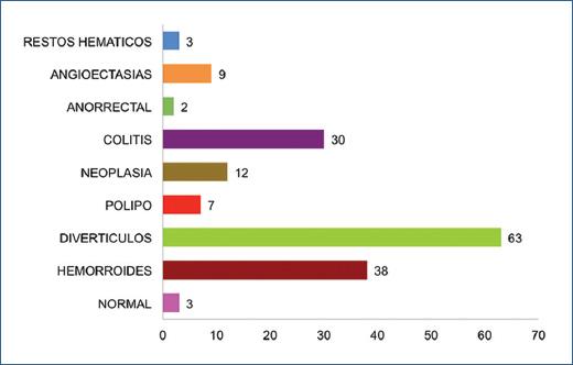 Se analizó un total de 167 pacientes, con las siguientes características basales (Tabla 1): una media de edad de 62±19 años, el 64.6% eran de sexo masculino, el 24.1% con tabaquismo activo, el 11.4% con diagnostico de DM2, el 36.7% con HAS, 1.9% con cirrosis, 6.3% con insuficiencia cardiaca, 4.4% con ERC, 8.9% con neoplasia, con una media de Charlson de 3 puntos. El 19% de los pacientes con consumo de antiagregantes y el 3.8% con consumo de anticoagulantes. En cuanto a la presentación clínica el 3.2% presentó sincope, el 16.4% evacuaciones diarreicas, el 32.4% dolor abdominal y sólo el 0.6% presentó sangrado activo durante su estancia en urgencias. La media de Hb fue de 13.4, INR 0.97 y la media de tiempo de su llegada a urgencias y la realización de colonoscopia fue de 19±11 horas, con los siguientes hallazgos (Gráfica 1): el 35.4% presento divertículos, el 24.1% enfermedad hemorroidal, el 18.4% colitis, el 7.6% neoplasia, el 5.7% angioectasias, el 3.8% pólipos, 1.9% normal y el 1.9% restos hemáticos sin evidencia de sitio de sangrado. En aquellos pacientes con sangrado activo (9 pacientes: Gráfica 2), se logró encontrar el sitio en el 89% cuando se realizo colonoscopia en las primeras 24 horas, al 28% se les coloco clip, al 28% hemospray y al 77.7% argón.