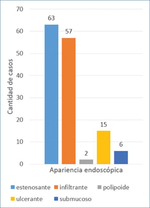 En cuanto a la apariencia endoscópica predominaron la forma estenosante 63 (37.5%) e infiltrante 57(33.9%), polipoide en 27 casos (16%), ulcerado en 15 (8.9%) y 6 con aspecto submucoso (3.5%). Figura 2.