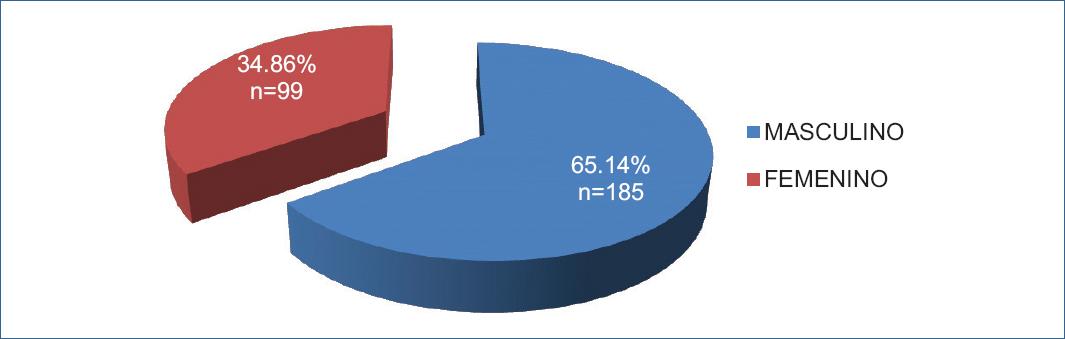 La población de estudio constó de 284 pacientes (N=284). La distribución de acuerdo al género, masculino 65.14% (n=185) y femenino. 34.86% (n=99) Gráfica No.1. La edad promedio fue 62.03+-17.72 años. El rango de edades osciló de 13 a 100 años. El grupo de edad donde hubo más paciente fue 68-78 años. Tabla No.1.