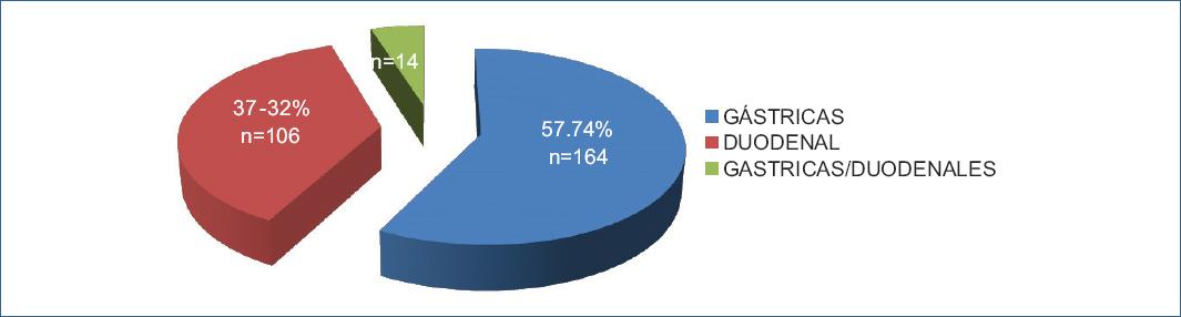 La localización más frecuente de las úlceras fue gástricas únicamente 57.74% (n=164), posteriormente duodenales únicamente 37.32% (n=106) y gastroduodenales 4.92% (n=4.92%). Gráfica No.2.