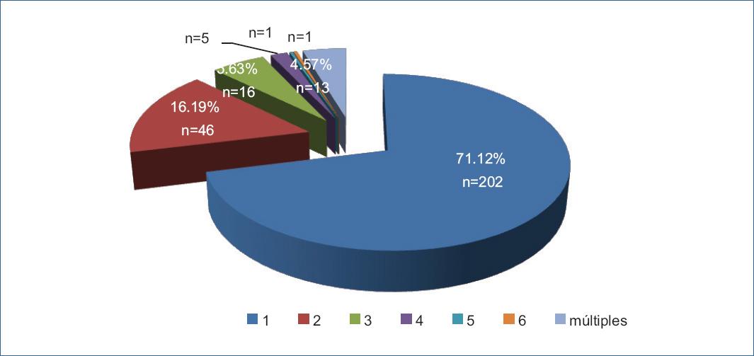 El 71.12% de los pacientes (n=202) tuvieron una úlcera solamente; 46 pacientes correspondieron al 16.19% a dos úlceras; un 5.63% (n=16) se le encontró tres lesiones ulceradas; úlceras “múltiples” en 4.57% (n=13). Gráfica No.3.