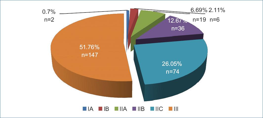 De acuerdo a los subgrupos basados en la Clasificación de Forrest: las úlceras grado III constituyeron el 51.76% de los pacientes (n=147), IIC 26.05% (n=74), IIB 12.67% (n=36), IIA 6.69% (n=19), IB 2.11% (n=6) y IA (0.7%).