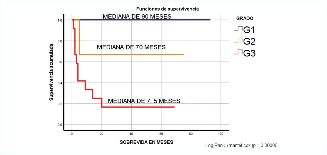 Se incluyeron 42 pacientes, 28 mujeres (66.67%) y 14 hombres (33.33%), media de edad de 55 ±13.7 años, el síntoma más reportado fue dispepsia (dolor en epigastrio) en 50%. Las características endoscópicas de las lesiones fue pólipos sésiles en 22 (52.4%) como pólipos pediculados 4 (9.5%), tumor 12 (28.6%), mucosa atrófica 4 (9.6%). Con respecto a los pólipos sésiles las características más observadas fueron superficie regular de la mucosa con patron de aspecto glandular y vasos tortuosos, y en menor proporción umbilicados. Los que se presentaban como tumor se dividieron conforme a la clasificación de BORRMANN encontrándose I (33.33%), II (8.33%, III (58.34%) y IV (0%). El tamaño de TNE-G > 10mm se observó en un 40.5%, las localizaciones más frecuentes fueron antro 6 (14.3%), antro-cuerpo 3 (7.1%), cuerpo 19 (45.2%), fondo 6 (14.3%), curvatura menor 1 (2.4%), curvatura mayor 5 (11.9%), incisura 2 (4.8%), resumiéndose en la tabla 1. Con base al grado histopatológico se dividieron en 3 grados con la siguiente frecuencia G1 27 (64.3%), G2 3 (7.1%) y G3 12 (28.6%), por inmunohistoquimica siendo positivo para cromogranina en el 88.1% de los pacientes y sinaptofisina en 90.5%, el 40.5% de los pacientes presentaban infección por helicobacter Pylori, se encontró gastritis atrófica en el 28.6, descritos en la tabla 2. Durante el periodo 2009-2013 se registraron 14 casos (26.2%) en contraste con 31(73.8%) en el periodo 2014-2018, casi triplicándose el número en los últimos cinco años. El 26.2% se encontraba en estadio clínico avanzado, con metástasis hepática en 83.33%. Hubo asociación entre tamaño de la lesión (>10mm) y estadio clínico avanzado con p=0.0003, OR 34.2 IC 95% (3.719 - 316.11). Se observó medianas de supervivencia global significativamente menores en lesiones (> 10mm) 14 meses p=.000283 y grado (G3) 7.5 meses p=0.00000.