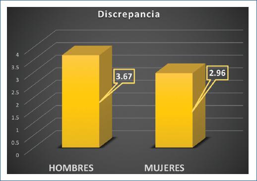 Con el análisis cuantitativo de t de Student, al comparar las discrepancias obtenidas entre los grupos de hombres y mujeres podemos observar una mayor discrepancia en el grupo de hombres (Gráfica 5)