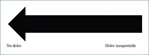 La escala visual análoga (VAS) es la herramienta más utilizada para estimar la severidad, así como el alivio del dolor (O Karcioglu, 2018) El evaluador le pide al paciente que elija un punto en una línea recta de 100mm en cuyo extremo izquierdo se establece como no dolor, y el extremo derecho se establece como el dolor insoportable, de esta manera gradúa el dolor de las últimas 24 h. (Figura 3). El no mostrar datos numéricos la vuelve impráctica en la vida diaria; sin embargo, es muy fácil de aplicar tanto en niños como adultos.