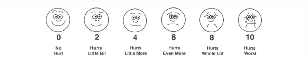 Las personas que no son capaces de establecer ninguna de las escalas anteriores, se les proporciona una serie de imágenes con caras que reflejan la intensidad de dolor que se experimenta y ayudar así a que se mida el dolor como la escala de puntuación de dolor con caras de Wong-Baker (Figura 5) (O Karcioglu, 2018) (Garra G1, 2013)