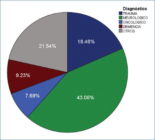En la figura 2 se muestra que la mayoría de los pacientes (43.08 %) a los que se les colocó sonda de gastrostomía endoscópica percutánea tenían algún diagnóstico neurológico, como evento vascular cerebral, epilepsia, enfermedad de Parkinson, infarto de la arteria cerebral media, enfermedad de Alzheimer, infarto cerebeloso, hemorragia subaracnoidea, o parálisis cerebral. En el 18.46% fue ingresado por trauma, el 7.69 % tenía diagnostico oncológico; el 9.23 % se le colocó por demencia y en el 21.54 % se les colocó debido a otros diagnósticos como lesión hipóxico-isquémica, mielinolisis extrapontina, hemorragia subaracnoidea, hematoma subdural agudo, encefalitis en estudio, neumonía en la comunidad, trastorno de la deglución, status posparo respiratorio y encefalopatía anóxico-isquémica, hipoglucémica, y metabólica.