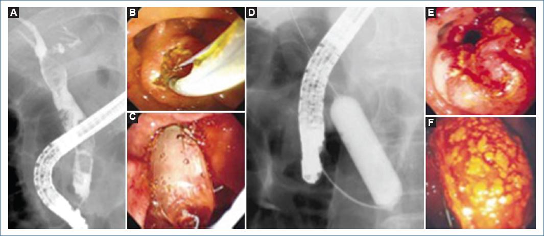 Figura 2 Esfinterotomía endoscópica con dilatación con balón. A: colangiografía que demuestra múltiples litos de gran tamaño. B: realización de esfinterotomía. C: dilatación con balón CRE 12-15 mm. D: control fluoroscópico de la dilatación. E: orificio biliar permeable. F: extracción de lito.
