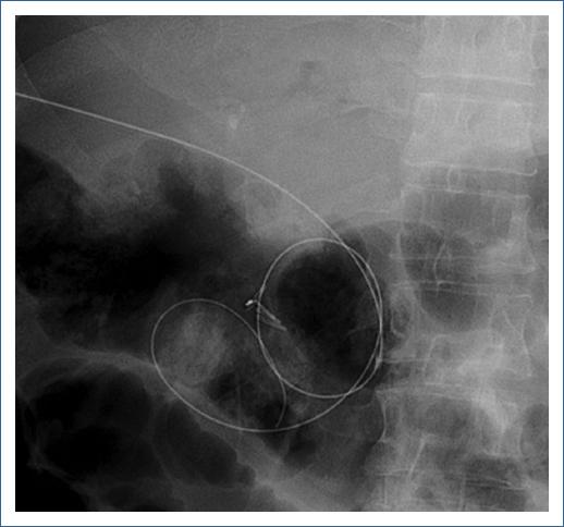 A 73-year-old male was diagnosed with pancreatic adenocarcinoma and underwent a modified Whipple procedure (pylorus-preserving) 3 years earlier. Two months before the presentation, the patient developed intermittent jaundice, low-grade fever, and pain in the upper right quadrant of the abdomen. With respect to biochemical data, total bilirubin was 11.7 mg/dL (normal range 0.4-1.5 mg/dL), alkaline phosphatase was 800 IU/L (normal range 32-91 IU/L), and gamma-glutamyl transpeptidase was 550 IU/L (normal range 7-50 IU/L). An abdominal ultrasound reported dilatation of the biliary tree (common bile duct 8.5 mm in diameter). Ascending cholangitis secondary to an ALS was suspected and the patient underwent an emergency ERCP. Access to the biliary tree was impossible due to post-surgical alterations in anatomy.
