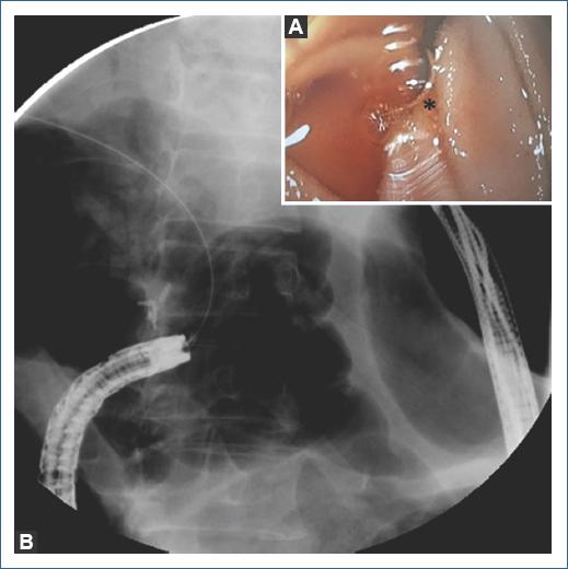 Figura 2 A: endoscopic view of the hydrophilic guidewire (asterix) emerging through the kinked choledochojejunostomy. B: hydrophilic guidewire retrieved with the endoscope.