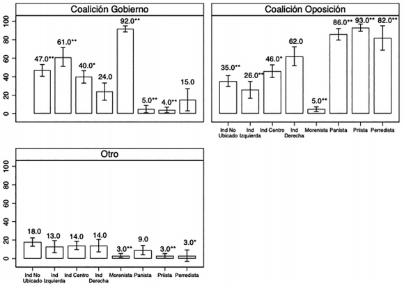En el caso del voto a la coalición Juntos Hacemos Historia (Coalición Gobierno) se observan diferencias acordes con las hipótesis planteadas. De los independientes, los independientes de izquierda muestran la mayor probabilidad de apoyar a esta coalición con 61% de probabilidad de voto, lo cual se distingue estadísticamente de la de los independientes de derecha quienes muestran la menor probabilidad con 24%. En seguida, los independientes de centro con una probabilidad de 40% y los independientes no ubicados con 47%.